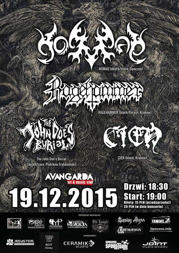 Awangarda Art&Music Club zaprasza na koncert, który odbędzie się 19 grudnia 2015 roku. Na scenie klubu wystąpią: Nomad (death/black, Opoczno), Ragehammer (black/thrash, Kraków), The John Doe's Burial (death/core, Piotrków Trybunalski), Cień (black, Kraków).