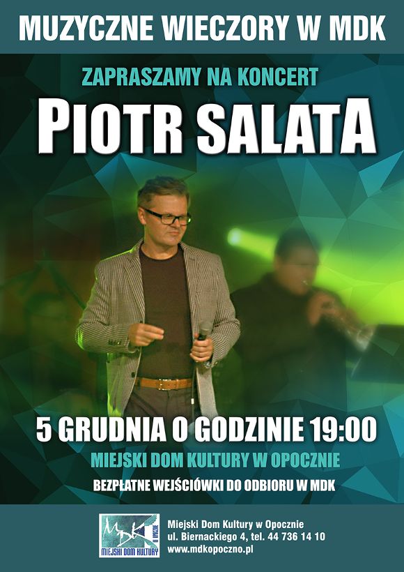 Miejski Dom Kultury w Opocznie zaprasza na koncert Piotra Salaty, który odbędzie się 5 grudnia 2015 roku w ramach Muzycznych Wieczorów w MDK.