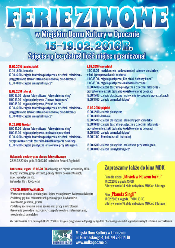 Miejski Dom Kultury w Opocznie zaprasza na bezpłatne zajęcia, które będą się odbywać podczas ferii zimowych.