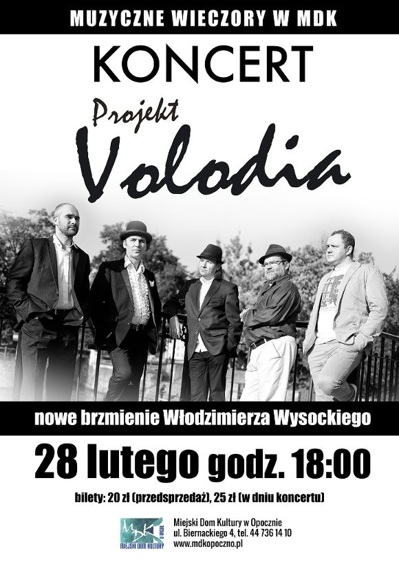 Miejski Dom Kultury w Opocznie zaprasza na koncert zespołu Projekt Volodia, który odbędzie się 28 lutego o godz. 18:00. Bilety w cenie 20 zł (przedsprzedaż) i 25 zł (w dniu koncertu) dostępne są w MDK.