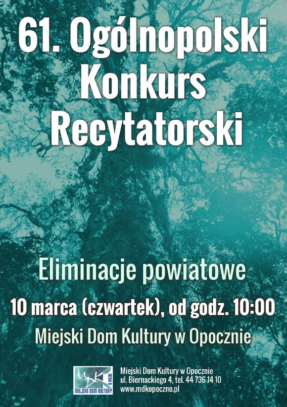 Miejski Dom Kultury w Opocznie zaprasza uczniów szkół ponadgimnazjalnych oraz dorosłych z terenu miasta i powiatu opoczyńskiego do udziału w 61. Ogólnopolskim Konkursie Recytatorskim.