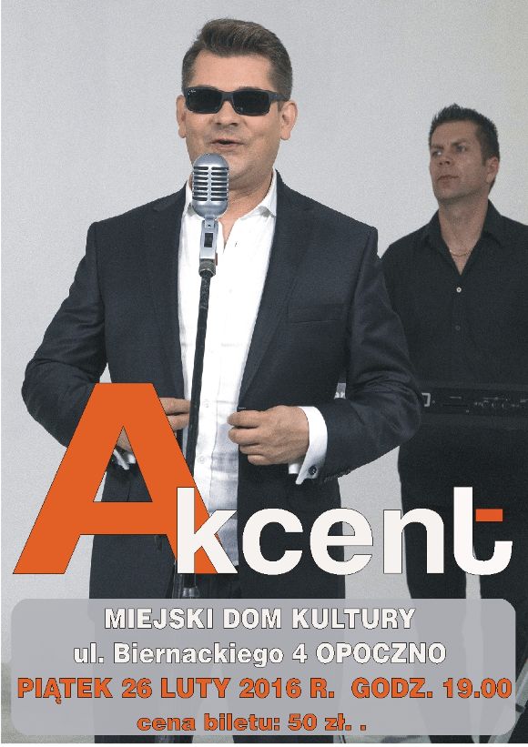 Zapraszamy na koncert zespołu AKCENT, który odbędzie się 26 lutego 2016 r. o godz. 19:00 w Miejskim Domu Kultury w Opocznie.