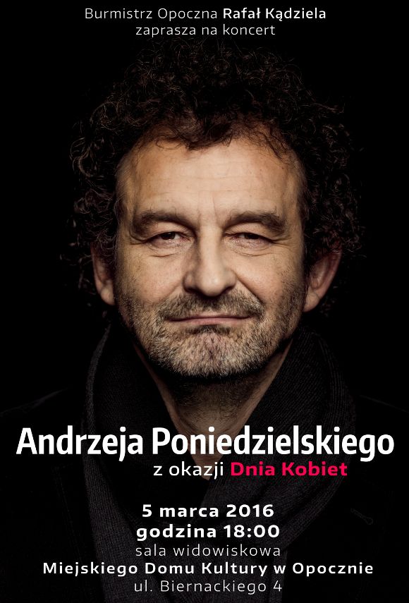 Burmistrz Opoczna Rafał Kądziela zaprasza na koncert Andrzeja Poniedzielskiego z okazji Dnia Kobiet, który odbędzie się 5 marca (sobota) 2016 roku o godzinie 18:00 w Miejskim Domu Kultury w Opocznie.