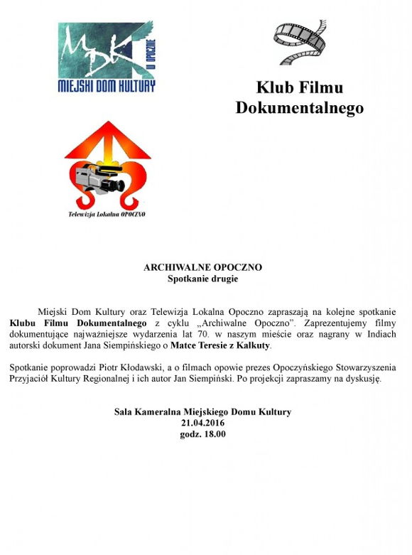21 kwietnia o godz. 18:00 w Sali Kameralnej Miejskiego Domu Kultury w Opocznie odbędzie się kolejne spotkanie Klubu Filmu Dokumentalnego.