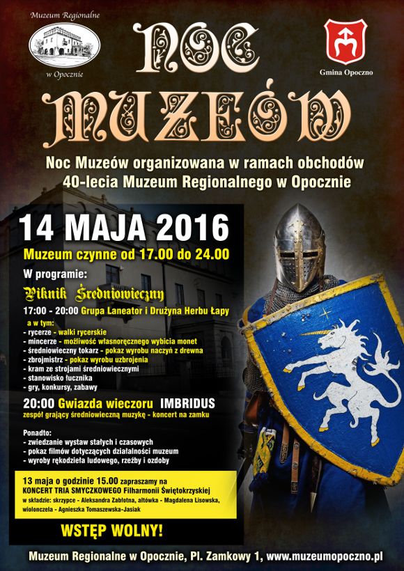 14 maja 2016 roku w godzinach 17:00-24:00 Muzeum Regionalne w Opocznie zaprasza na Noc Muzeów, które w tym roku będzie związane z jubileuszem 40 lecia istnienia placówki.