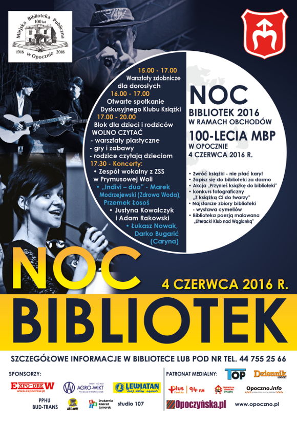 Miejska Biblioteka Publiczna w Opocznie zaprasza 4 czerwca 2016 roku na Noc Bibliotek, która w tym roku wpisana będzie w ramy 100 lecia opoczyńskiej placówki.