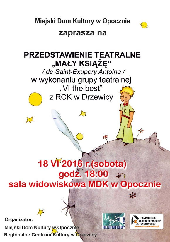 Miejski Dom Kultury w Opocznie zaprasza na przedstawienie teatralne „Mały Książę” (Antonie de Saint-Exupery) w wykonaniu grupy teatralnej „VI the best” z Regionalnego Centrum Kultury w Drzewicy.