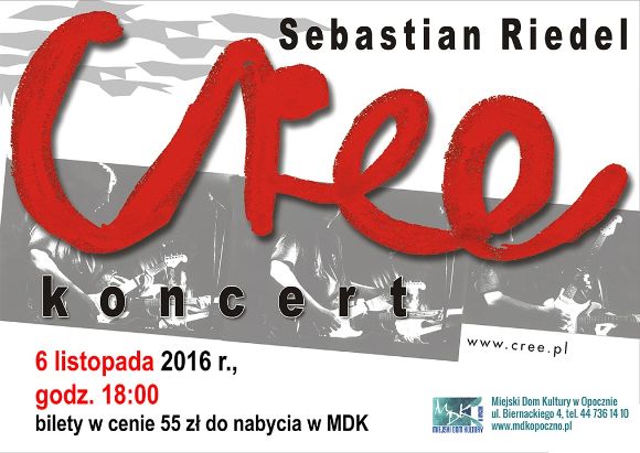 Miejski Dom Kultury w Opocznie zaprasza na koncert Sebastiana Riedla & CREE, który odbędzie się 6 listopada 2016 r. o godz. 18:00 w MDK Opoczno. Bilety w cenie 55 zł do nabycia w Miejskim Domu Kultury w Opocznie.