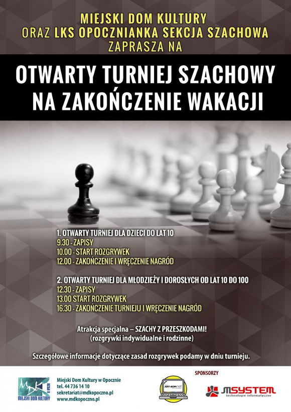 Miejski Dom Kultury wraz z LKS Opocznianka Sekcja Szachowa zapraszają na Otwarty Turniej Szachowy Na Zakończenie Wakacji, który odbędzie się w najbliższą niedzielę, 4 września.