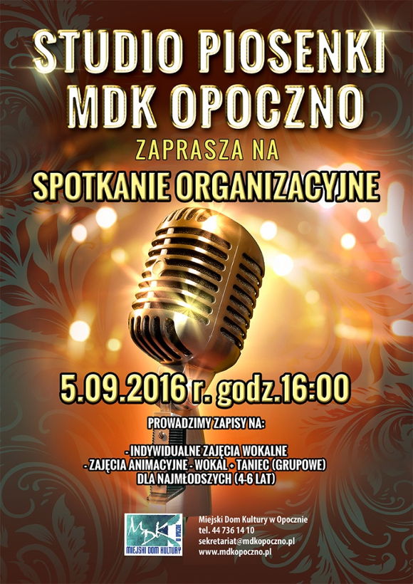 Studio Piosenki Miejskiego Domu Kultury w Opocznie zaprasza na spotkanie organizacyjne, które odbędzie się 5 września (poniedziałek) o godz. 16:00 w Miejskim Domu Kultury w Opocznie.