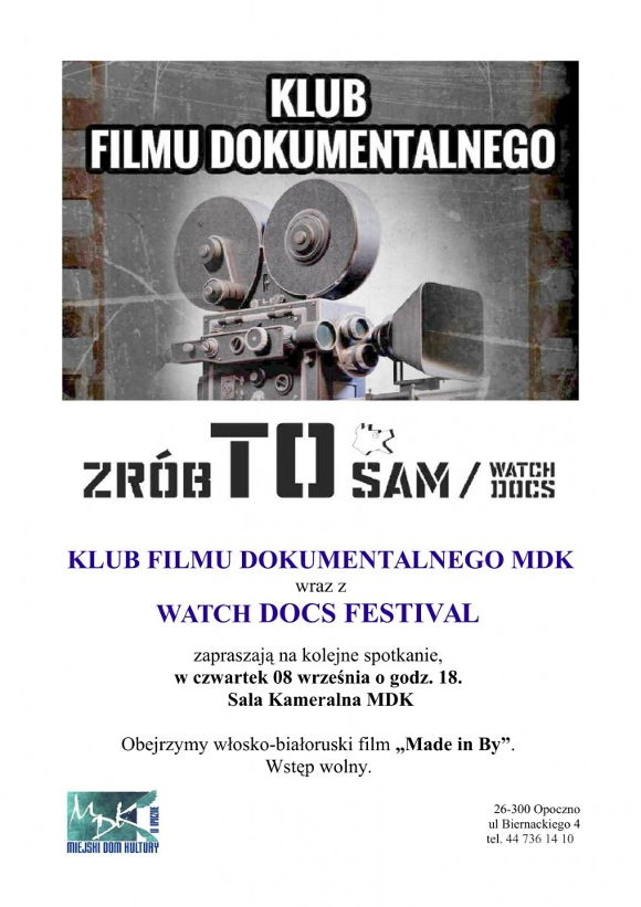 Miejski Dom Kultury zaprasza na kolejne spotkanie Klubu Filmu Dokumentalnego. W ramach współpracy z Watch Docs Festival, w czwartek, 8 września o godz. 18 wyświetlimy film "Made in BY".