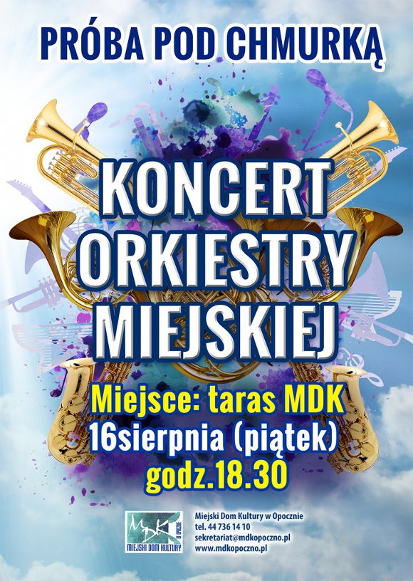 Miejski Dom Kultury w Opocznie zaprasza na otwartą próbę Orkiestry Miejskiej, która odbędzie się w piątek, 16 września o godzinie 18:30 na tarasie Miejskiego Domu Kultury w Opocznie.