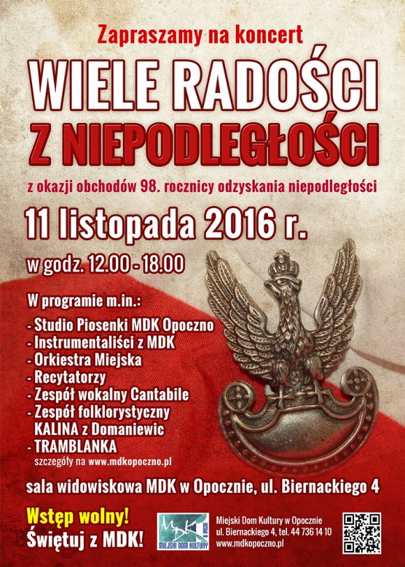 Po oficjalnej części obchodów, o godzinie 12:00 zapraszamy do Miejskiego Domu Kutury na koncert WIELE RADOŚCI Z NIEPODLEGŁOŚCI
