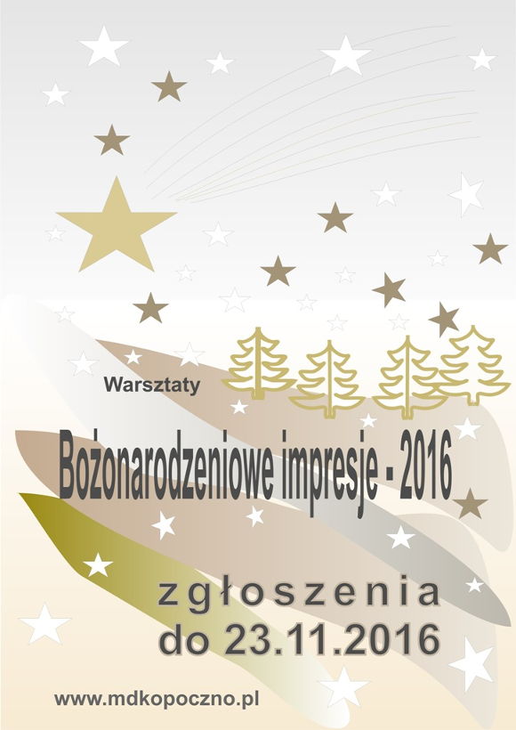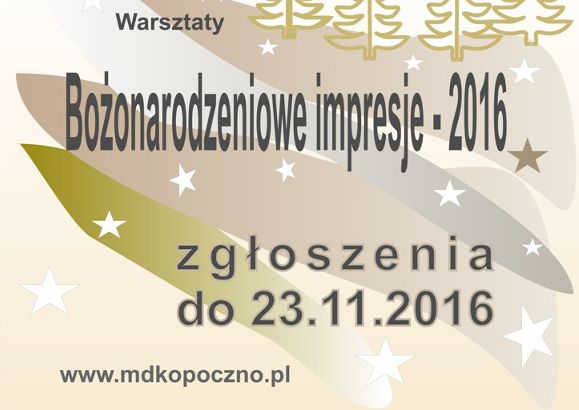 Miejski Dom Kultury w Opocznie zaprasza do udziału w warsztatach p.n. "Bożonarodzeniowe Impresje 2016", które odbędą się w dniach 28 i 29 listopada 2016 w godzinach od 9.00 do 13.00.