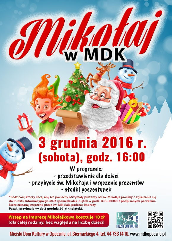 Rodziców, którzy chcą, aby ich pociechy otrzymały prezenty od św. Mikołaja prosimy o zgłaszanie się do Punktu Informacyjnego MDK (poniedziałek-piątek w godz. 8:00-20:00) z podpisanymi paczkami, które zostaną wręczone przez św. Mikołaja podczas imprezy. Paczki przyjmujemy do 2 grudnia 2016 r. (piątek).