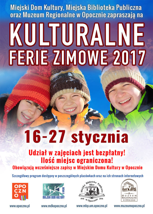 Miejski Dom Kultury, Miejska Biblioteka Publiczna oraz Muzeum Regionalne w Opocznie zapraszają do udziału w bezpłatnych zajęciach, które odbędą się w pomiędzy 16 a 27 stycznia 2017 roku ramach kulturalnych ferii zimowych.