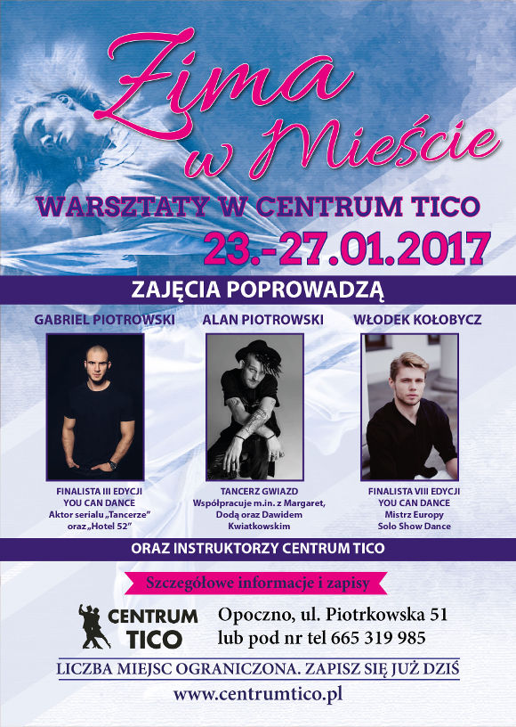 Stacjonarne warsztaty "Zima w mieście" już za chwilę! Od 23 stycznia, tylko w TICO i to przez cały tydzień wyjątkowe zajęcia z hip-hopu, jazzu, modernu, tańca towarzyskiego, stretchingu i fitnessu, poprowadzą m.in. finaliści programu "You can dance".