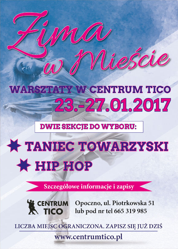 Centrum TICO zaprasza na wyjątkowe warsztaty! „Zima w mieście” to obowiązkowy punkt programu zimowych wakacji dla wszystkich miłośników tańca. Już w drugim tygodniu ferii do naszej szkoły zawita fantastyczna trójka trenerów, która wraz z instruktorami TICO poprowadzi równie fantastyczne zajęcia z hip-hopu, jazzu, modernu, tańca towarzyskiego, stretchingu i fitnessu. Z tak energetycznym teamem żadne mrozy nie są straszne! Rozgrzejcie z nami parkiet do czerwoności! Stratujemy już 23 stycznia.