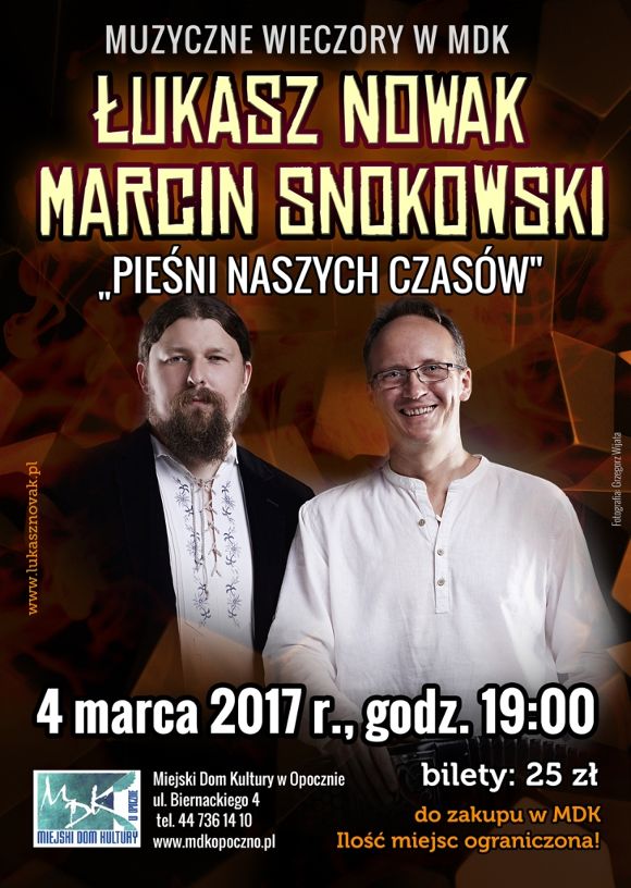 Miejski Dom Kultury w Opocznie zaprasza na kolejny koncert z cyklu Muzyczne Wieczory w MDK. Tym razem spotykamy się 4 marca 2017 r. o godz. 19:00 w sali kameralnej Miejskiego Domu Kultury w Opocznie. Łukasz Nowak i Marcin Snokowski zaprezentują „Pieśni naszych czasów”.
