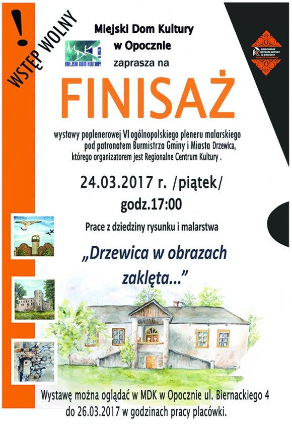 Miejski Dom Kultury w Opocznie zaprasza na finisaż wystawy poplenerowej VI ogólnopolskiego pleneru malarskiego „Drzewica w obrazach zaklęta…” pod patronatem Burmistrza Gminy i Miasta Drzewica, który odbędzie się 24 marca 2017 r. o godz. 17:00.