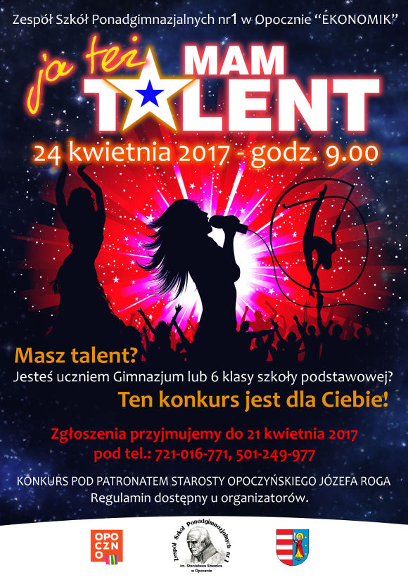 Wszystkich zainteresowanych uczniów gimnazjów i uczniów klas szóstych szkół podstawowych z terenu powiatu opoczyńskiego serdecznie zapraszamy do udziału w konkursie „Ja Też Mam Talent”.