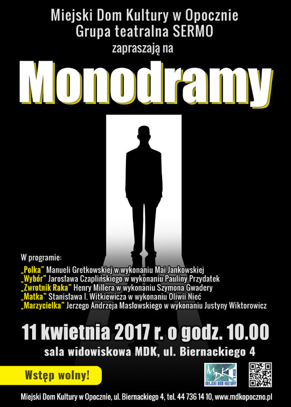 Miejski Dom Kultury w Opocznie oraz Grupa teatralna SERMO zapraszają 11 kwietnia 2017 roku o godzinie 10:00 na Monodramy.