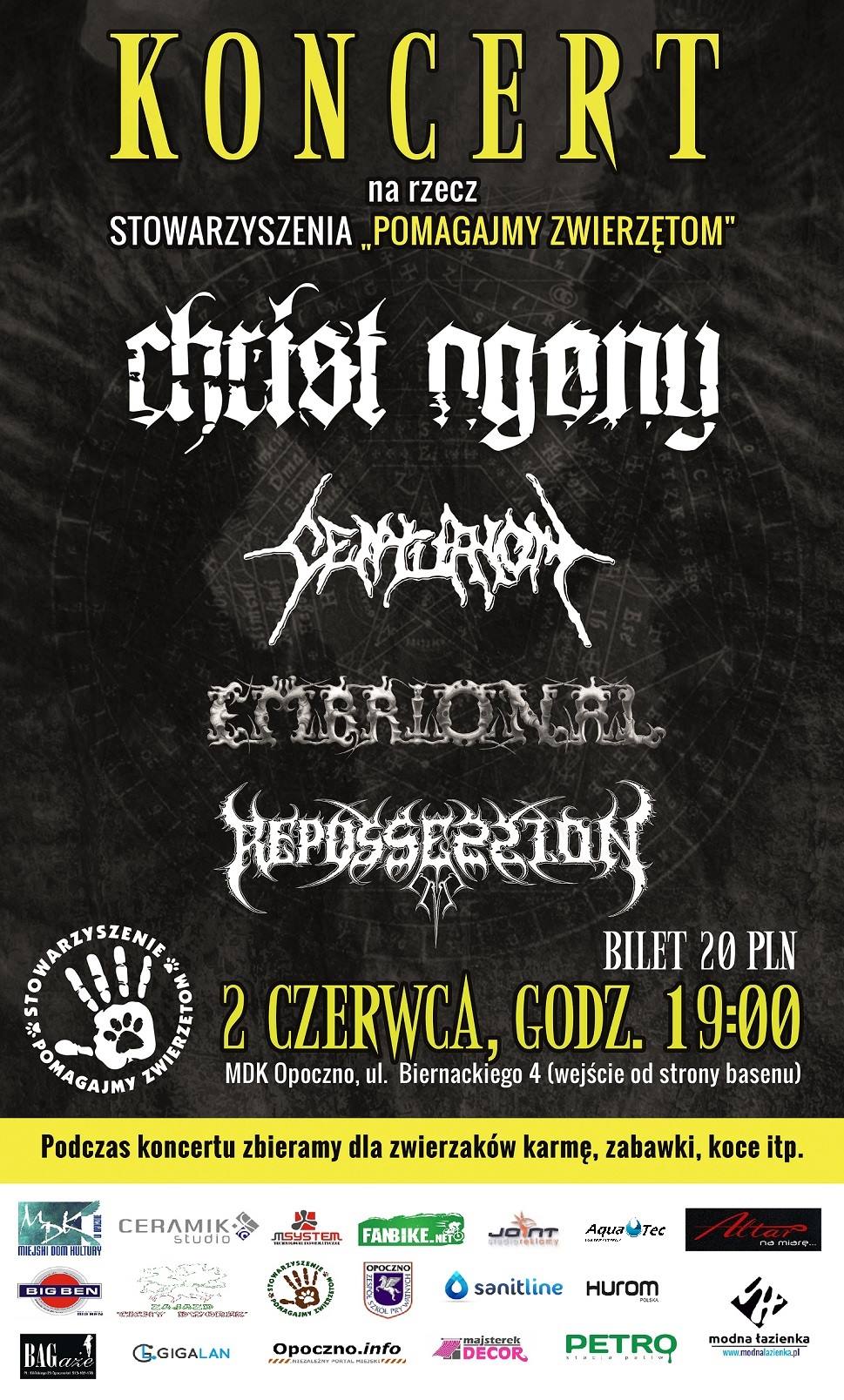 Zapraszamy na koncert charytatywny na rzecz Stowarzyszenia "Pomagajmy zwierzętom", który odbędzie się 2 czerwca 2017 roku. Na scenie zobaczymy Christ Agony, Centurion, Embrional i Repossession.