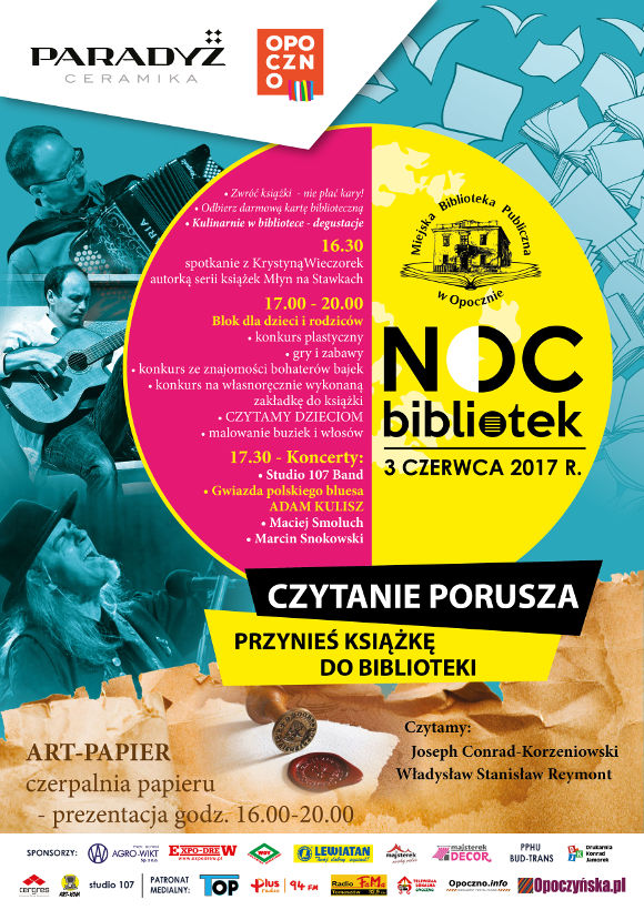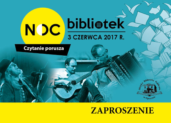 Miejska Biblioteka Publiczna w Opocznie zaprasza na Noc Bibliotek 2017, która odbędzie się 3 czerwca 2017 roku. Tym razem przyświecać jej będzie hasło "Czytanie porusza".