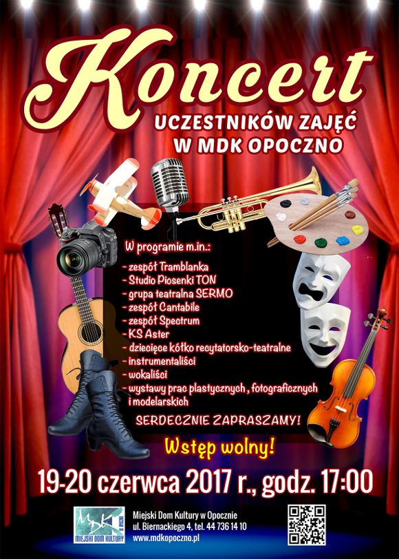Miejski Dom Kultury w Opocznie zaprasza na koncert uczestników zajęć w Miejskim Domu Kultury w Opocznie, który odbędzie się w dniach 19 i 20 czerwca 2017 roku. Początek o godz. 17:00.