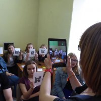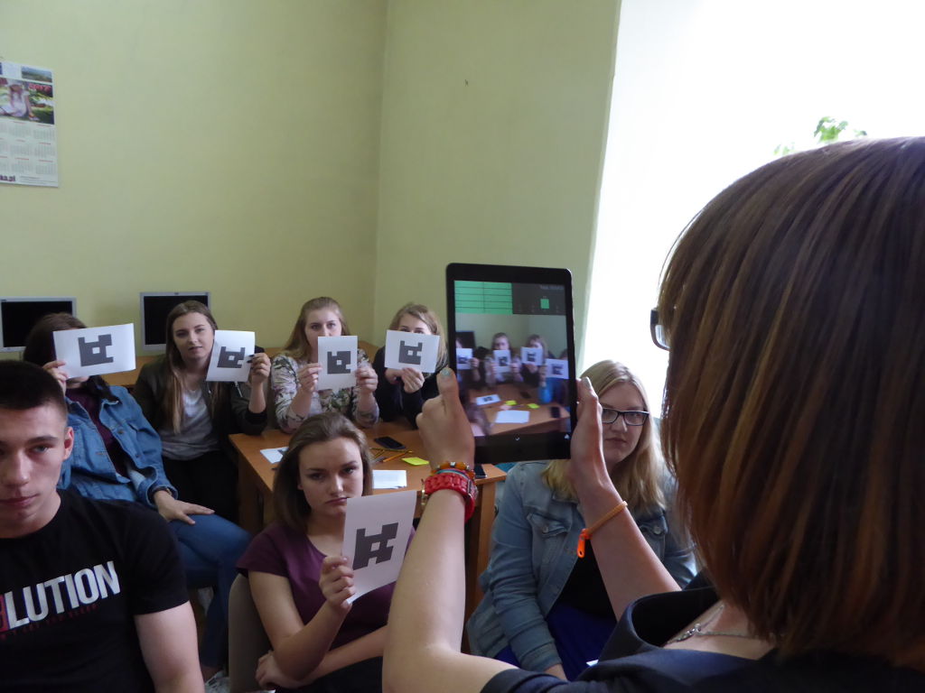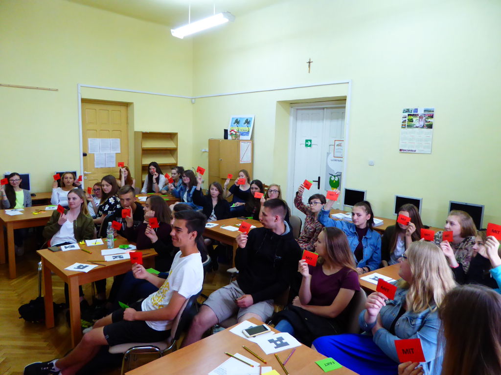 Uczniowie sprawdzili również swoją dotychczasową wiedzę na temat kultury żydowskiej w quizie przygotowanym za pomocą aplikacji Plickers. Nowoczesna forma testu spodobała się gościom, a odpowiedzi na pojawiające się w quizie pytania pozwoliły dowiedzieć się więcej.