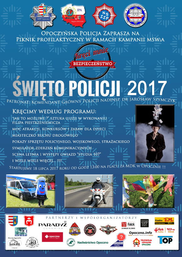 Komenda Powiatowa Policji w Opocznie zaprasza na Piknik Profilaktyczny z okazji powiatowych obchodów Święta Policji, które odbędą się w dniu 18 lipca 2017 roku.