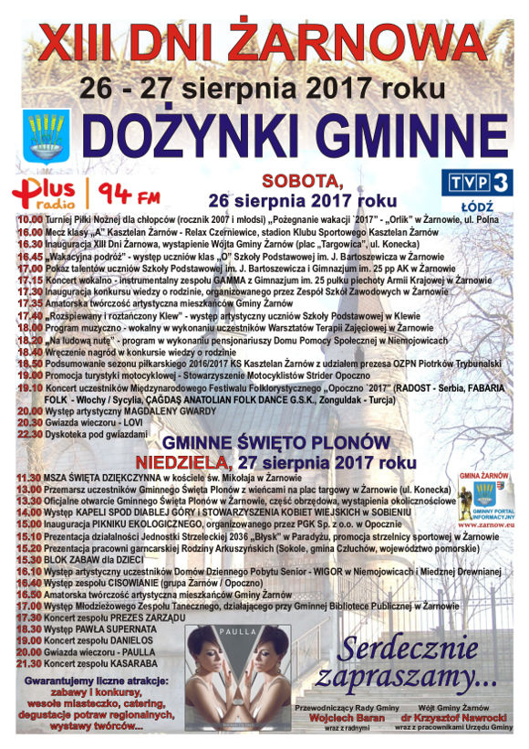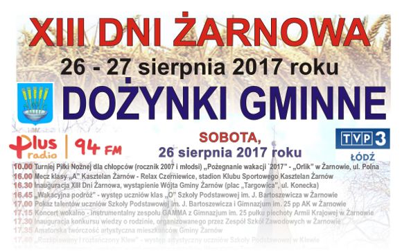 Gmina Żarnów zaprasza na XIII Dni Żarnowa i Dożynki Gminne w Żarnowie, które odbędą się w najbliższy weekend, t.j. 26 i 27 sierpnia 2017 roku.