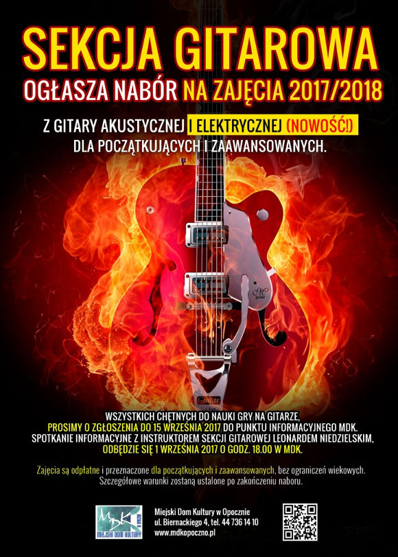 Wszystkich chętnych do nauki gry na gitarze akustycznej oraz elektrycznej, a także tych którzy chcą doskonalić swoje umiejętności, Miejski Dom Kultury w Opocznie zaprasza do sekcji gitarowej MDK. Zapisy przyjmowane są do 15 września 2017 roku.