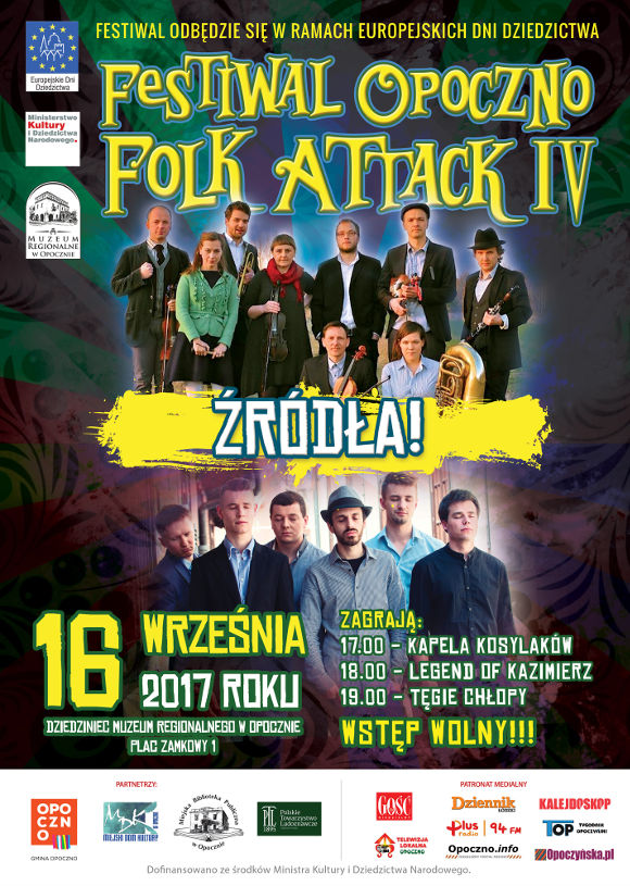 Festiwal Opoczno Folk Attack IV – Źródła! tak jak poprzednio, odbędzie się w ramach Europejskich Dni Dziedzictwa 2017. Patronami Festiwalu jest Gmina Opoczno, Miejski Dom Kultury w Opocznie, Miejska Biblioteka Publiczna w Opocznie oraz Polskie Towarzystwo Ludoznawcze Oddział w Łodzi. Opoczno Folk Attack IV został dofinansowany ze środków Ministerstwa Kultury i Dziedzictwa Narodowego.