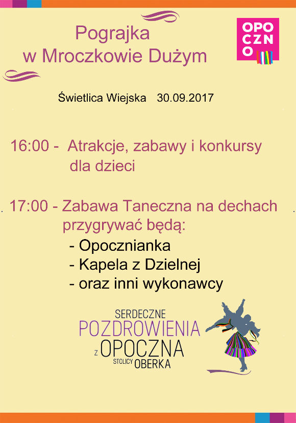 Gmina Opoczno oraz Koło Gospodyń Wiejskich z Mroczkowa Dużego zapraszają w sobotę, 30 września do świetlicy wiejskiej w Mroczkowie Dużym na pograjkę.