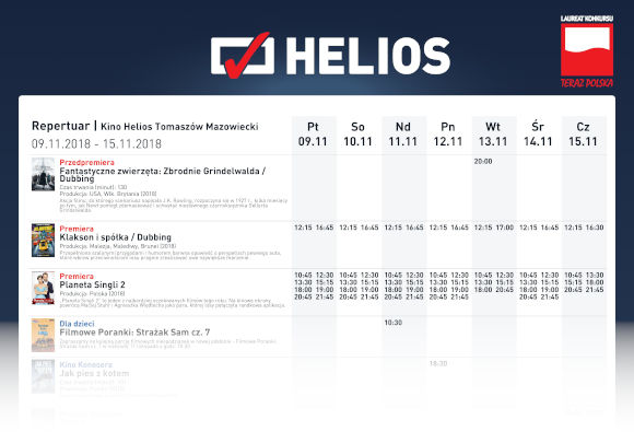 | Repertuar Kina Helios w Tomaszowie Maz. 09-15.11.2018 | ||||