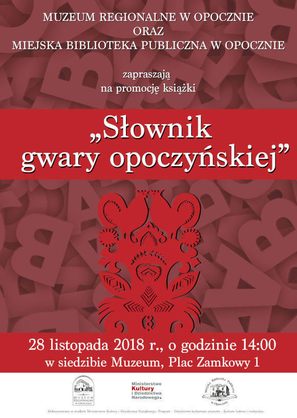 Muzeum Regionalne w Opocznie oraz Miejska Biblioteka Publiczna w Opocznie zapraszają na promocję książki „Słownik gwary opoczyńskiej”, która obędzie się w środę 28 listopada 2018 r. w siedzibie opoczyńskiego Muzeum przy Placu Zamkowym 1. Początek o godzinie 14:00.