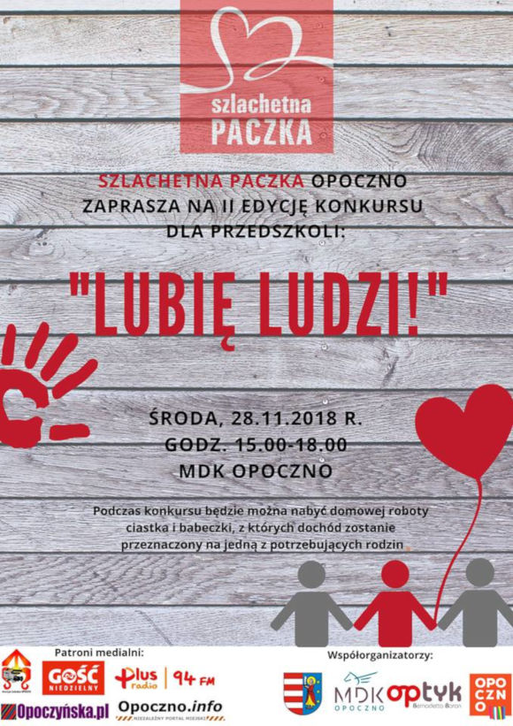 W środę 28 listopada w godzinach od 15 do 18 na scenie MDK w Opocznie zaprezentują się zespoły z opoczyńskich przedszkoli i „zerówek”. Konkurs „Lubię Ludzi” organizowany jest przez opoczyńską Szlachetną Paczkę i ma na celu promowanie otwartości, życzliwości i chęci niesienia pomocy drugiemu człowiekowi.