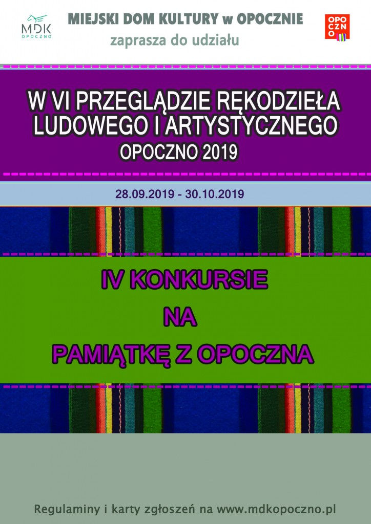 Miejski Dom Kultury w Opocznie przypomina i jednocześnie zaprasza do udziału w VI Przeglądzie Rękodzieła Ludowego i Artystycznego oraz do udziału w IV Konkursie na Pamiątkę z Opoczna.