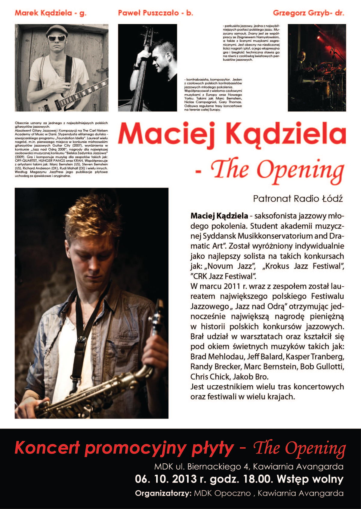 Avangarda Art&Music Club zaprasza 6 października o godzinie 18:00 na koncert jazzowy w wykonaniu Macieja Kądzieli. Koncert wchodzi w cykl imprez promujących ostatnią płytę Macieja Kądzieli – "The Opening"