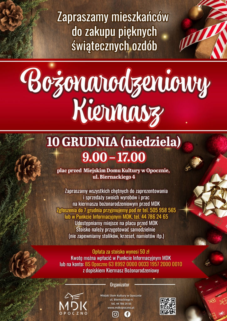Opłata za stoisko wynosi 50 zł. Kwotę można wpłacić w Punkcie Informacyjnym MDK lub na konto: BS Opoczno 63 8992 0000 0033 1957 2000 0010 z dopiskiem Kiermasz Bożonarodzeniowy
