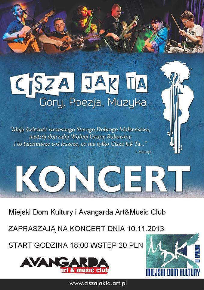 Avangarda Art&Music Club oraz Miejski Dom Kultury zapraszają na koncert "Cisza jak ta", który odbędzie się 10. listopada 2013 roku o godzinie 18:00