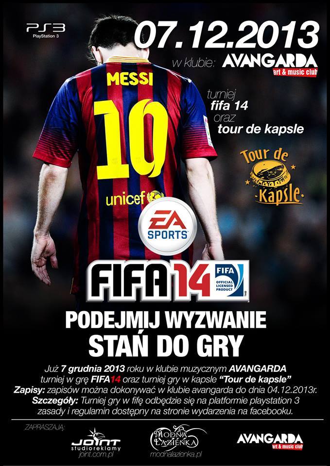 Art&Music Club Avangarda zaprasza na turniej w grę FIFA14 oraz turniej gry w kapsle "Tour de kapsle", które odbędą się 7. grudnia 2013 roku. Zapisów można dokonywać w klubie do dnia 4. grudnia 2013 roku.