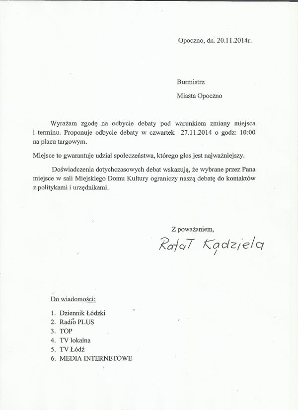 Rafał Kądziela, kontrkandydat obecnego Burmistrza zgodził się na debatę, jednak w innym terminie i w innym miejscu. Zaproponował więc czwartek, 27 listopada o godzinie 10:00. Miejscem miałby być plac targowy.
