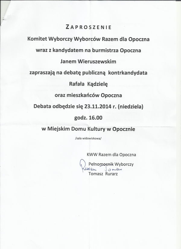 Oficjalne zaproszenie na debatę z prośbą o publikację informacji otrzymałem w środę, ok. godziny 15:00. Poniżej jego treść: