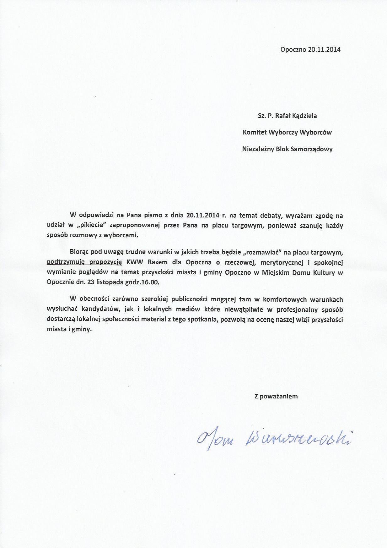 Jan Wieruszewski, konktrkandydat Rafała Kądzieli w wyborach na Burmistrza Opoczna godzi się na udział w debacie na placu targowym, nazywając ją pikietą. Jednocześnie podtrzymuje stanowisko swojego komitetu w sprawie przeprowadzenia debaty, która miałaby się odbyć w najbliższą niedzielę, tj. 23. listopada 2014 roku o godzinie 16:00 w sali widowiskowej Miejskiego Domu Kultury.