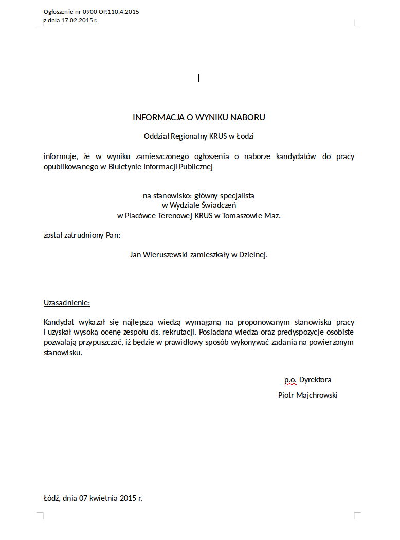Jak uzasadnia Piotr Majchrowski w informacji o wynikach naboru : "Kandydat wykazał się najlepszą wiedzą wymaganą na proponowanym stanowisku pracy i uzyskał wysoką ocenę zespołu ds. rekrutacji. Posiadana wiedza oraz predyspozycje osobiste pozwalają przypuszczać, iż będzie w prawidłowy sposób wykonywać zadania na powierzonym stanowisku."