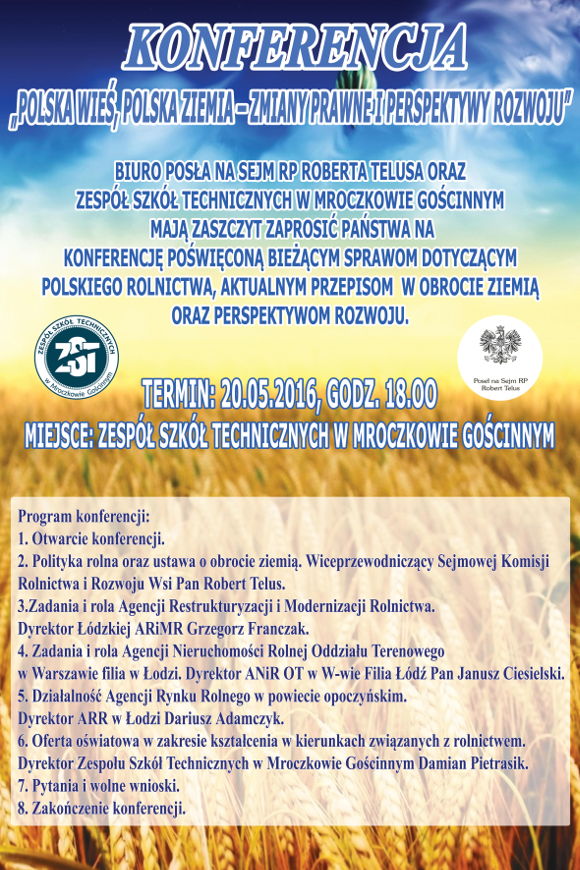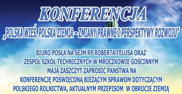 Biuro Posła na Sejm RP Roberta Telusa i Zespół Szkół Technicznych w Mroczkowie Gościnnym zapraszają na konferencję poświęconą bieżącym sprawom polskiego rolnictwa, zmianom w przepisach o obrocie ziemią oraz perspektywom rozwoju.