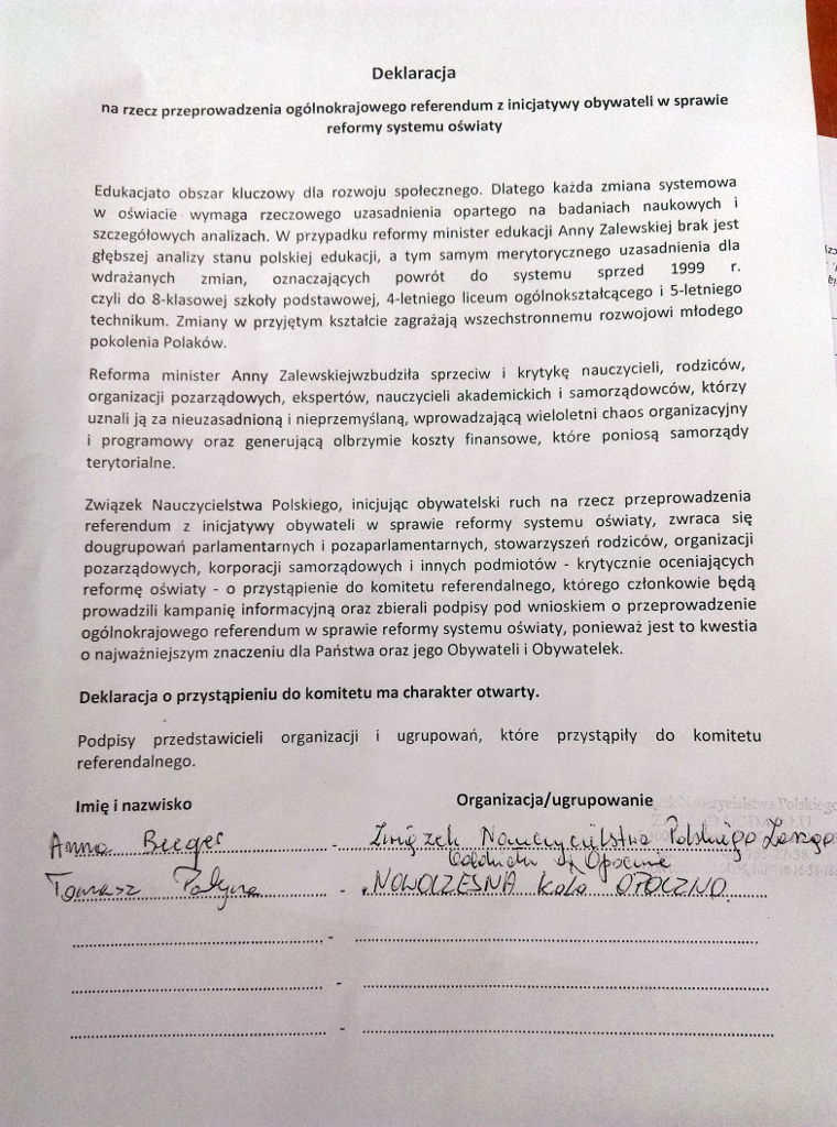W dniu 7 lutego Koło .Nowoczesna Opoczno razem z opoczyńskim oddziałem ZNP, podpisało wspólną deklarację zbierania podpisów, na rzecz przeprowadzenia ogólnopolskiego referendum w sprawie wprowadzenia przez rząd PiS niszczącej reformy systemu oświaty.