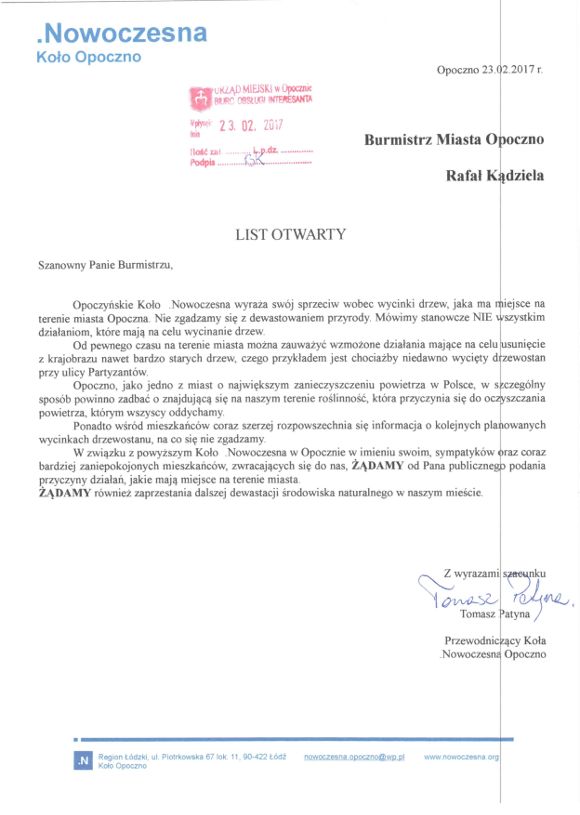 Opoczyńskie koło .Nowoczesnej wystosowało list otwarty do Burmistrza Opoczna Rafała Kądzieli, w sprawie wycinki drzew na terenie miasta. List jest wyrazem sprzeciwu przeciwko zaistniałej sytuacji oraz prośbą o wyjaśnienie planów Urzędu co do losu drzewostanu na pl. Kościuszki.